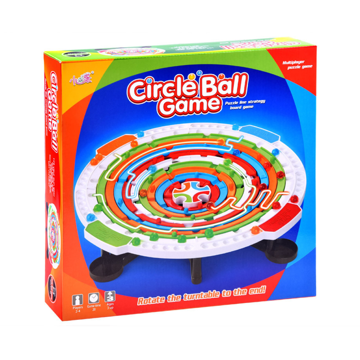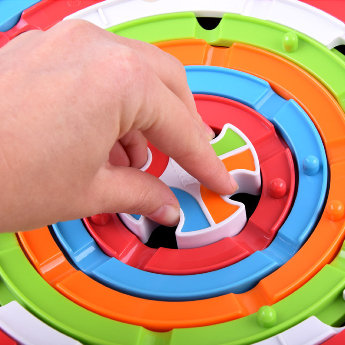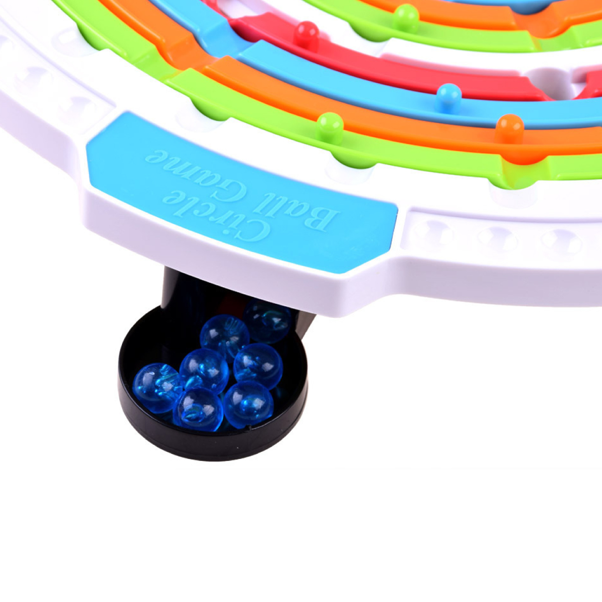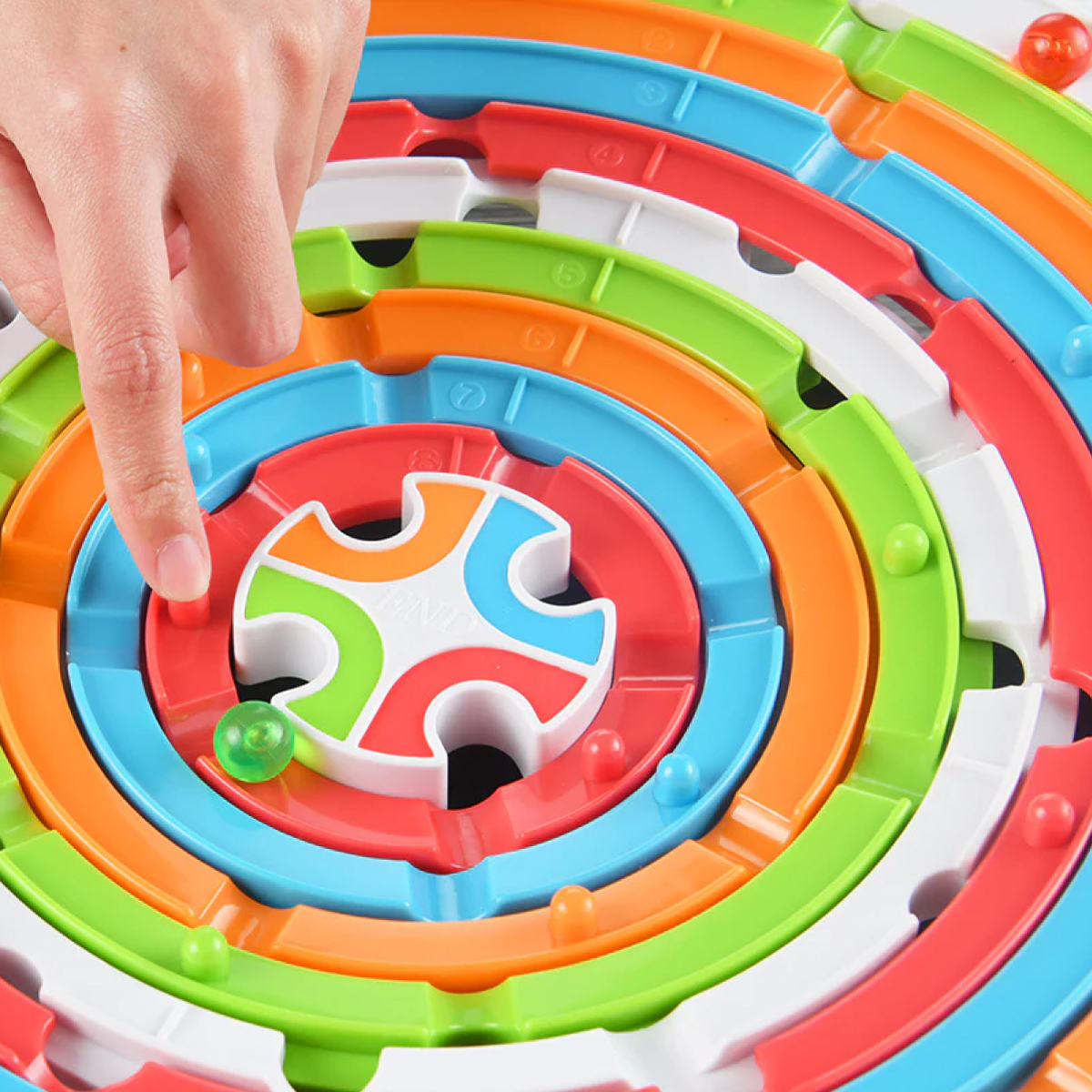 Contenido del empaque: 1 tablero base circular con anillos rotativos, canicas de colores (rojo, azul, verde, naranja) y soportes de base.