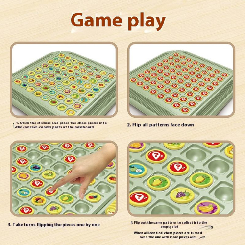 El objetivo es simple pero desafiante: los jugadores deben encontrar pares de figuras idénticas ocultas bajo las fichas con el signo de interrogación. Si logras el par, recolectas las fichas en tu sección del tablero. ¡El jugador con más fichas al final de la partida gana!