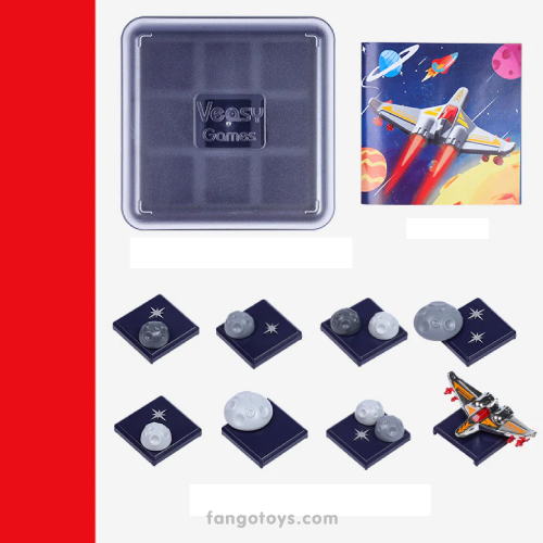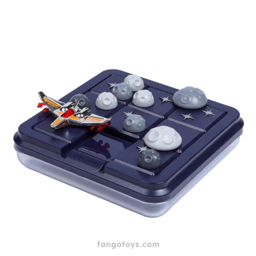 Contenido: 1 tablero de juego con tapa, 1 nave espacial, piezas de asteroides/planetas y guía de desafíos con soluciones.