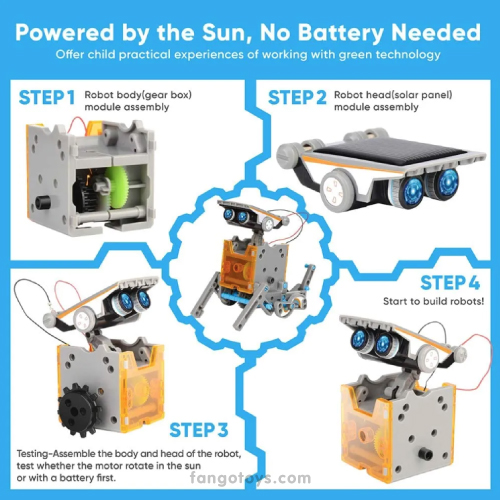 Contiene una batería que se alimenta por el sol, no se necesitan baterías. El Kit de robot incluye un panel de energía solar que recoge la energía térmica solar en un motor de accionamiento de energía eléctrica, que impulsa los engranajes para que la máquina funcione sin problemas.