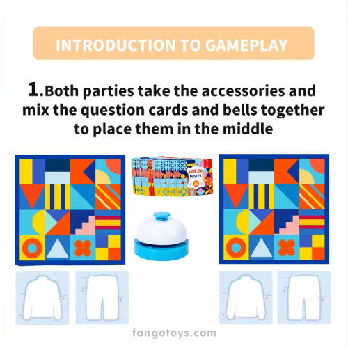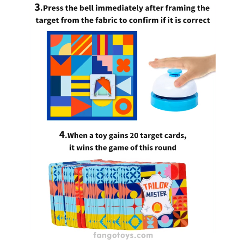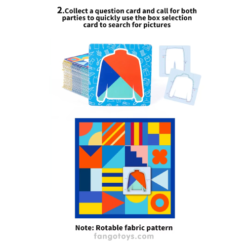Juego de mesa para dos jugadores. El juego consiste en encontrar el patrón o diseño adecuado para el suéter o el pantalón según corresponda a la tarjeta. Se más rápido en encontrar que tu tu oponente y toca la campana. (hay patrones simples en una celda y hay diferentes que constan de dos celdas adyacentes). Un juego para quienes les gusta la velocidad y reacción.